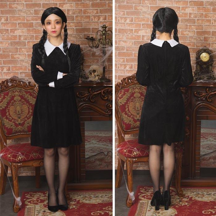 Amazon ウィッグ付き ベルベットワンピースガール ゴースト 幽霊 ゾンビ お化け ホラー 怖い 魔女 悪魔 ワンピース 大人 アダムスファミリー ウェンズデーアダムス かわいい コスプレ コスプレ衣装 コスチューム ハロウィン 忘年会 仮装 衣装 即納 S Cs 6g127